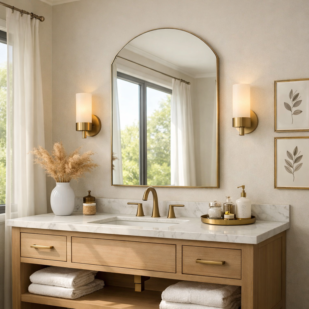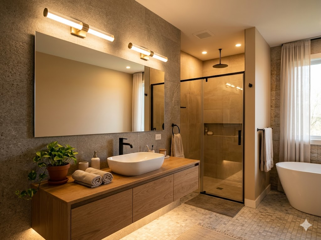 Selon les12 conseils d’aménagement de salle de bain , l’ajout de lumières autour du miroir et au plafond crée une atmosphère chaleureuse et élégante.