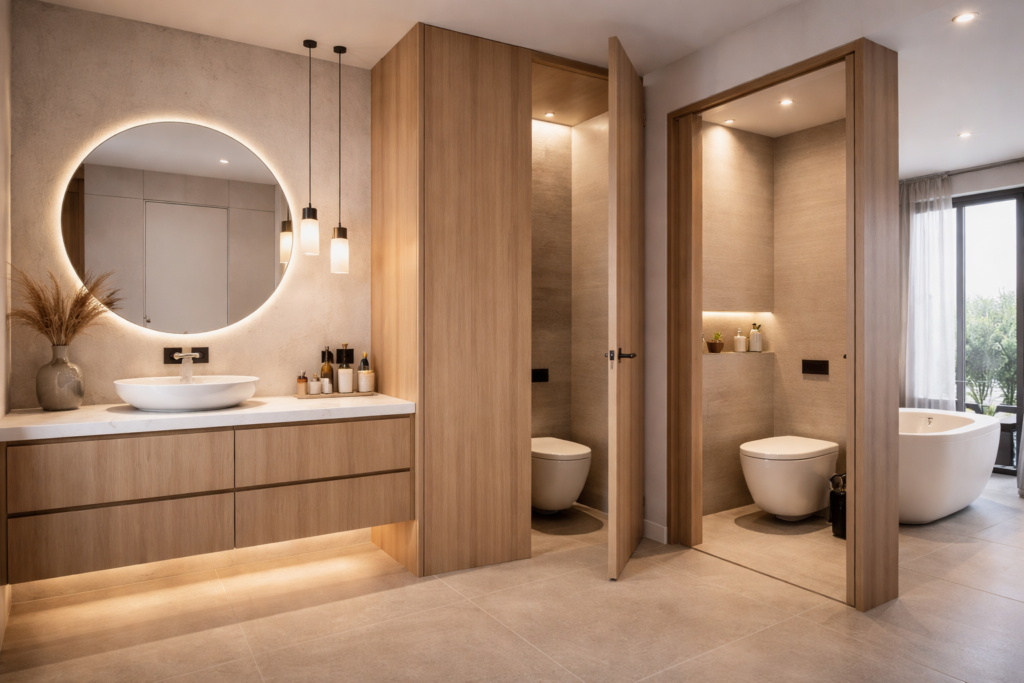 Il est préférable de ne pas placer les toilettes directement visibles depuis l’entrée. Cela améliore l’esthétique et donne une impression plus propre et organisée.