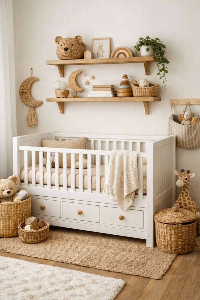Un rangement malin maintient la chambre organisée sans encombrer l’espace. Les tiroirs sous le lit ou la table à langer sont parfaits pour les vêtements et les couches. Les étagères murales permettent de stocker les essentiels en hauteur tout en libérant le sol. Les paniers cachent les petits objets et réduisent le désordre visuel.