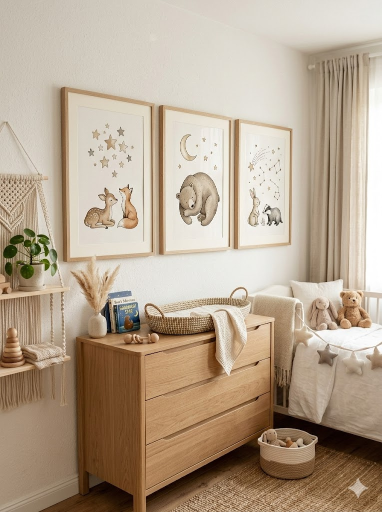 Le décor mural apporte de la personnalité sans occuper le sol. Des illustrations douces, des alphabets ou des animaux stimulent la curiosité tout en restant apaisants. Évitez de surcharger les murs pour conserver un espace visuellement calme.