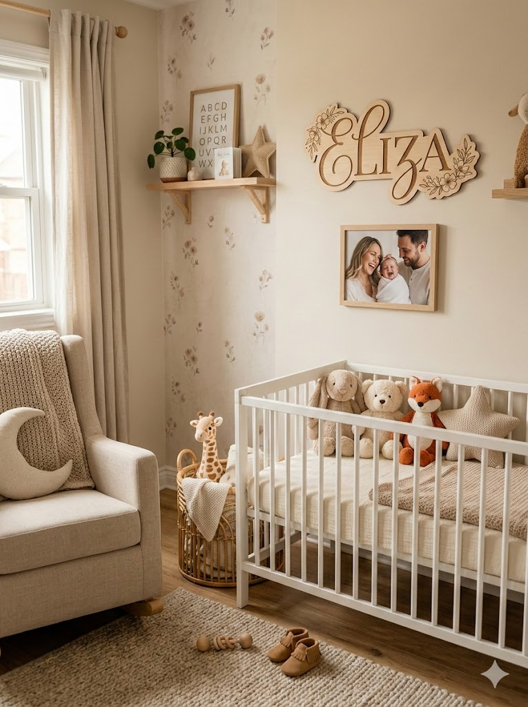 Les détails personnels rendent la chambre émotionnellement significative. Un panneau avec le prénom, une photo de famille ou un objet fait main crée un sentiment d’appartenance et rend l’espace unique et chaleureux.