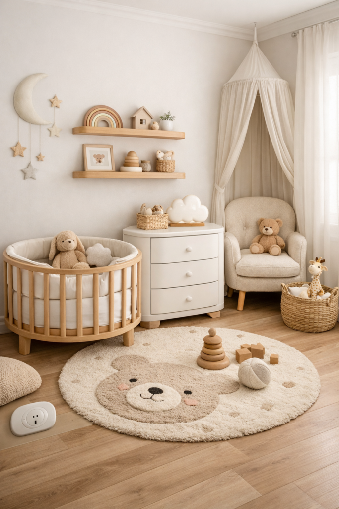 La sécurité doit guider chaque décision d’aménagement. Les meubles aux bords arrondis préviennent les blessures, les étagères sécurisées réduisent les risques. Les prises électriques doivent être couvertes et les fils hors de portée. Une disposition stable minimise les dangers à mesure que le bébé devient plus mobile.