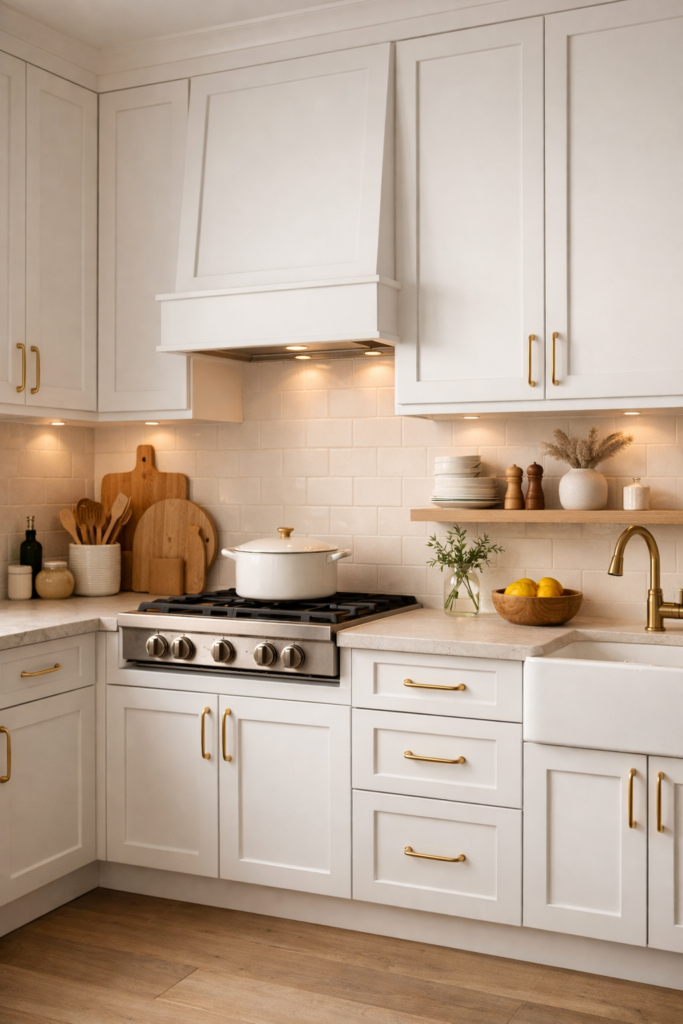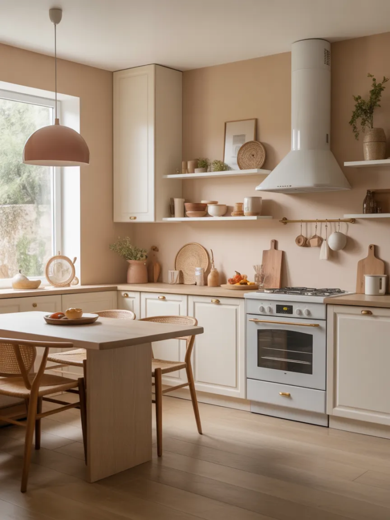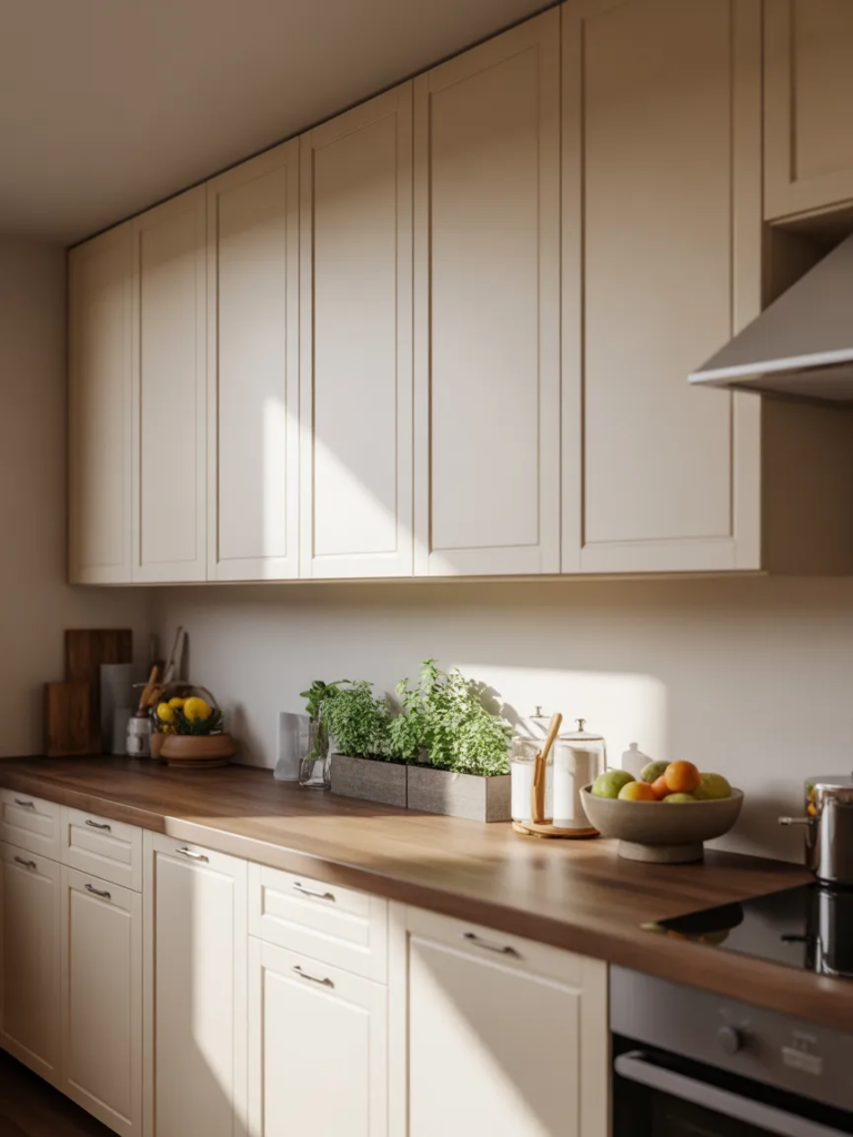 Pour éviter un décor trop simple, ajoutez des textures comme le bois, la céramique ou le lin. Cette combinaison fait partie des meilleurs conseils de décoration de cuisine cosy pour créer une ambiance raffinée et chaleureuse.