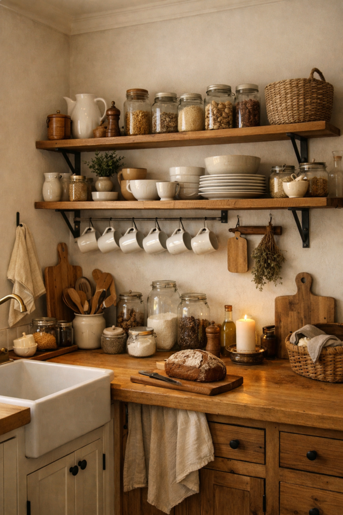 Pour réussir ce style, privilégiez un bois naturel clair ou légèrement vieilli. Combinez les étagères avec une palette de couleurs neutres pour garder une ambiance douce et élégante. Parmi les conseils de décoration de cuisine cosy, cette idée est parfaite pour créer une atmosphère chaleureuse et organisée.