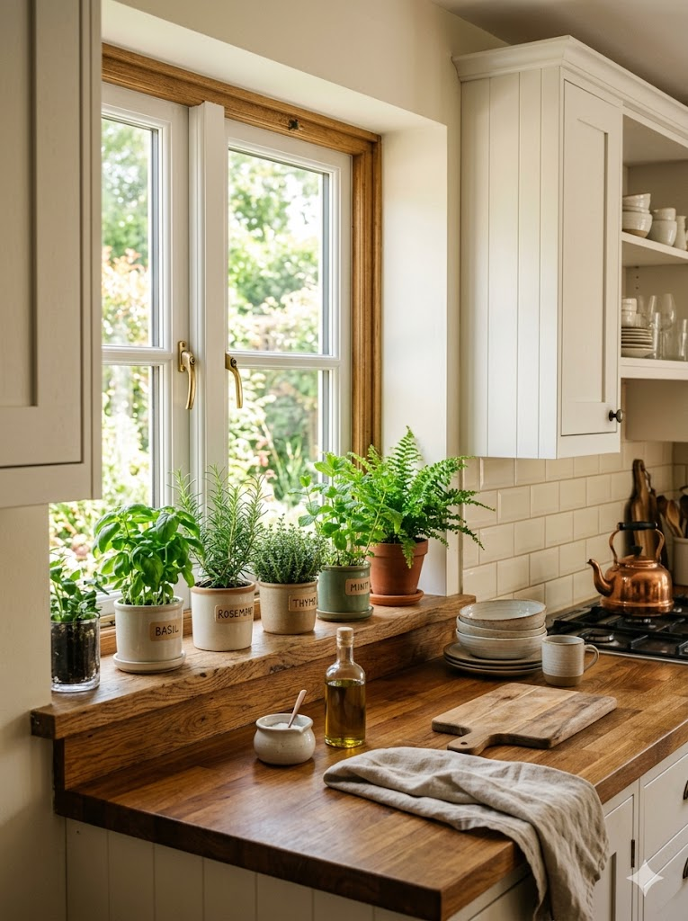 Les plantes vertes apportent instantanément de la vie et de la fraîcheur dans une cuisine. Des herbes aromatiques comme le basilic, la menthe ou le romarin sont à la fois décoratives et utiles pour la cuisine quotidienne. Placées près d’une fenêtre, elles profitent de la lumière naturelle.