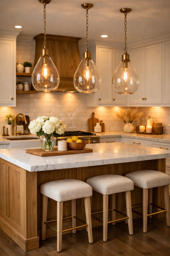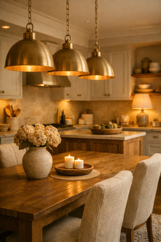 Les lampes suspendues au-dessus d’un îlot ou d’une table ajoutent aussi une touche décorative très tendance. Ces conseils de décoration de cuisine cosy permettent de transformer une cuisine simple en un espace élégant où la lumière met en valeur chaque détail du décor.