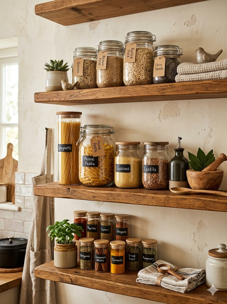 Pour un effet encore plus charmant, choisissez des bocaux de tailles différentes. Cette idée fait partie des conseils de décoration de cuisine cosy qui combinent fonctionnalité et style dans un esprit minimaliste.