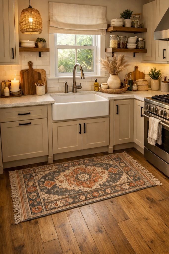 Choisissez un tapis facile à nettoyer et résistant à l’humidité. Ce détail décoratif fait partie des conseils de décoration de cuisine cosy qui apportent immédiatement une touche chaleureuse tout en améliorant le confort.