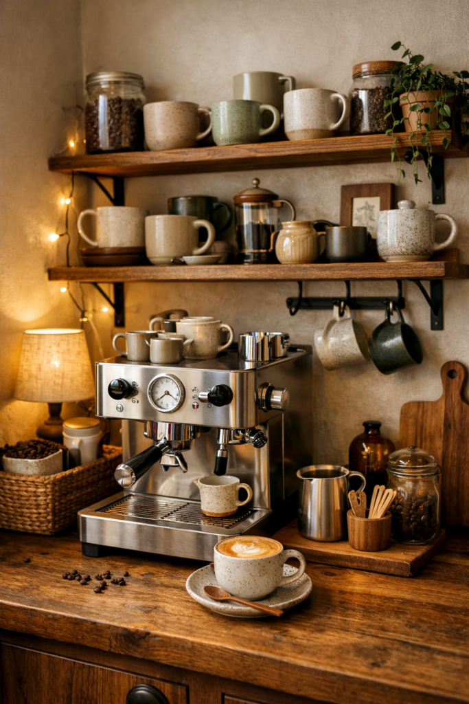 Créer un petit coin café est une excellente manière de rendre votre cuisine plus conviviale. Une machine à café, quelques tasses suspendues et une petite étagère suffisent pour créer cet espace dédié aux moments de détente.