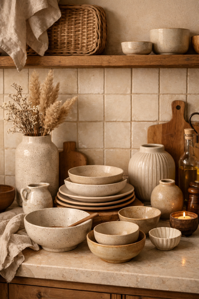 Les accessoires en céramique ajoutent une touche artisanale à la décoration de la cuisine. Bols, vases ou assiettes exposés sur une étagère créent un style authentique et chaleureux.