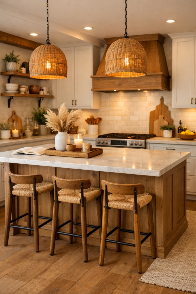 Ce contraste naturel crée une ambiance équilibrée et intemporelle. C’est également l’un des conseils de décoration de cuisine cosy les plus simples à appliquer pour un résultat élégant.