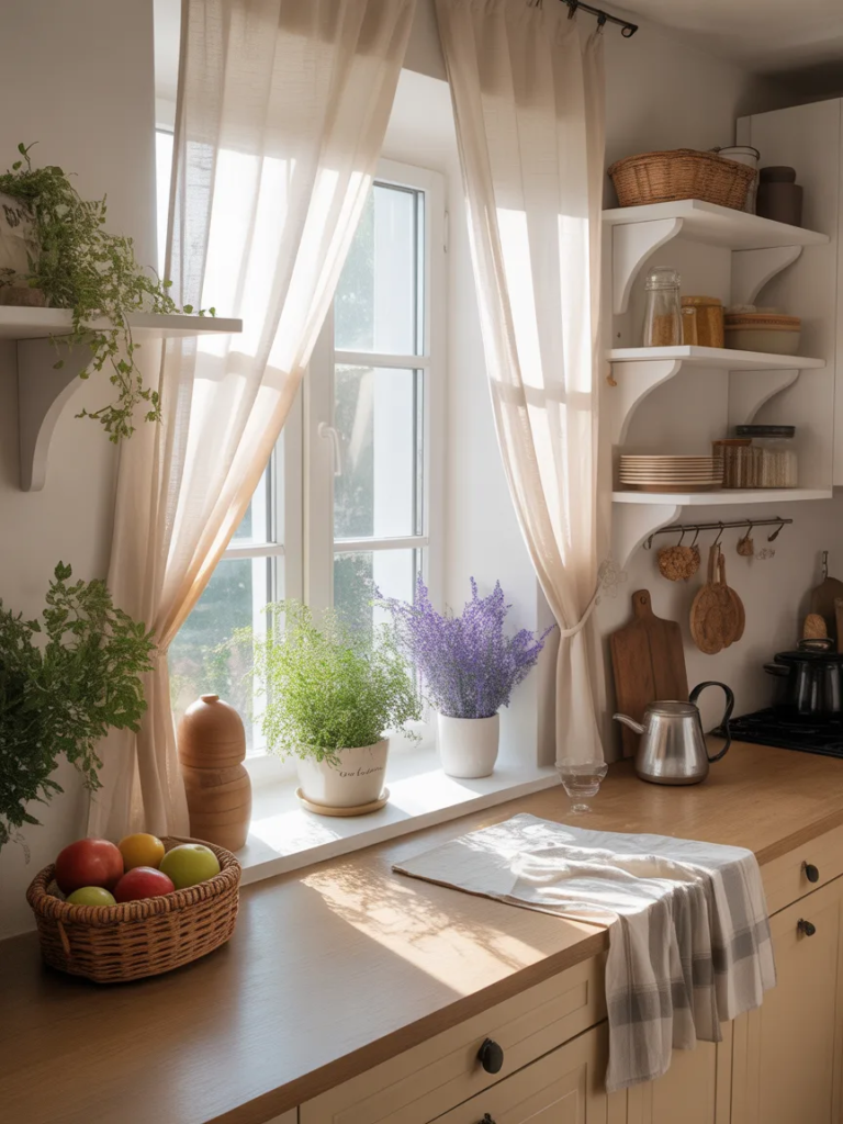 Les rideaux légers permettent à la lumière naturelle d’entrer tout en apportant une touche décorative douce. Des tissus comme le lin ou le coton créent une ambiance chaleureuse et élégante. Ils adoucissent l’espace et donnent un aspect plus intime à la cuisine.
