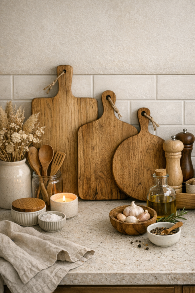 Les planches à découper en bois peuvent devenir de véritables éléments décoratifs lorsqu’elles sont exposées sur le plan de travail. Leur texture naturelle apporte chaleur et authenticité à la cuisine. Différentes tailles et formes créent un effet visuel intéressant.