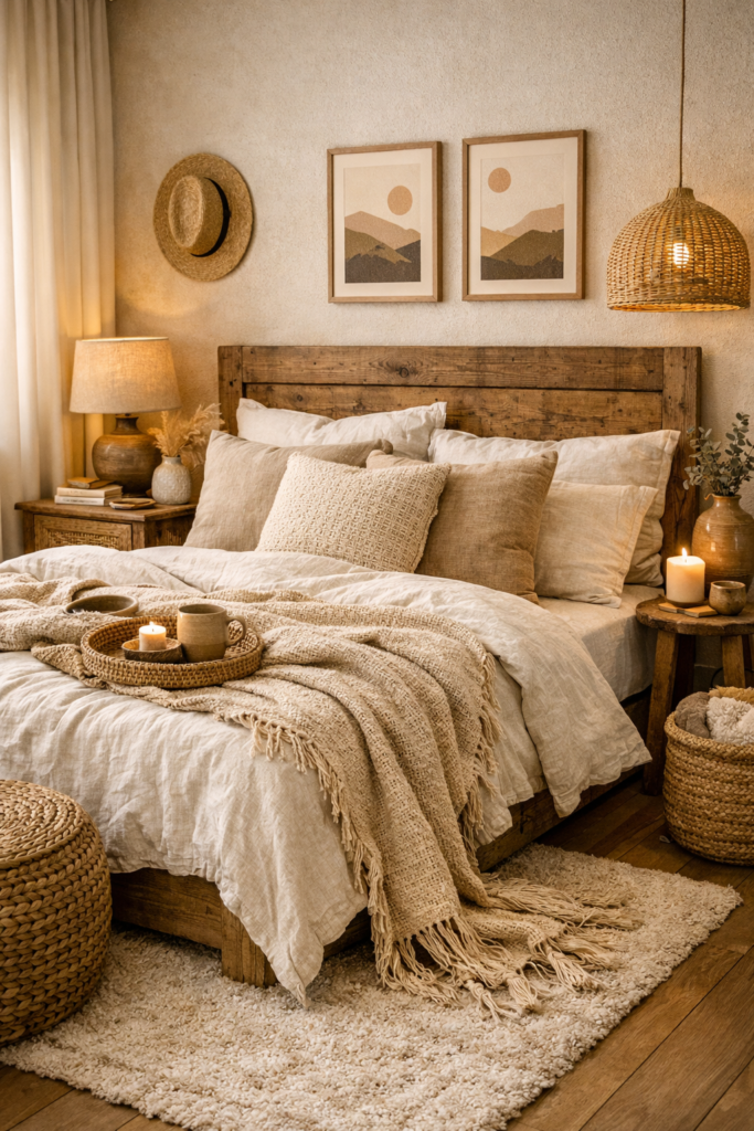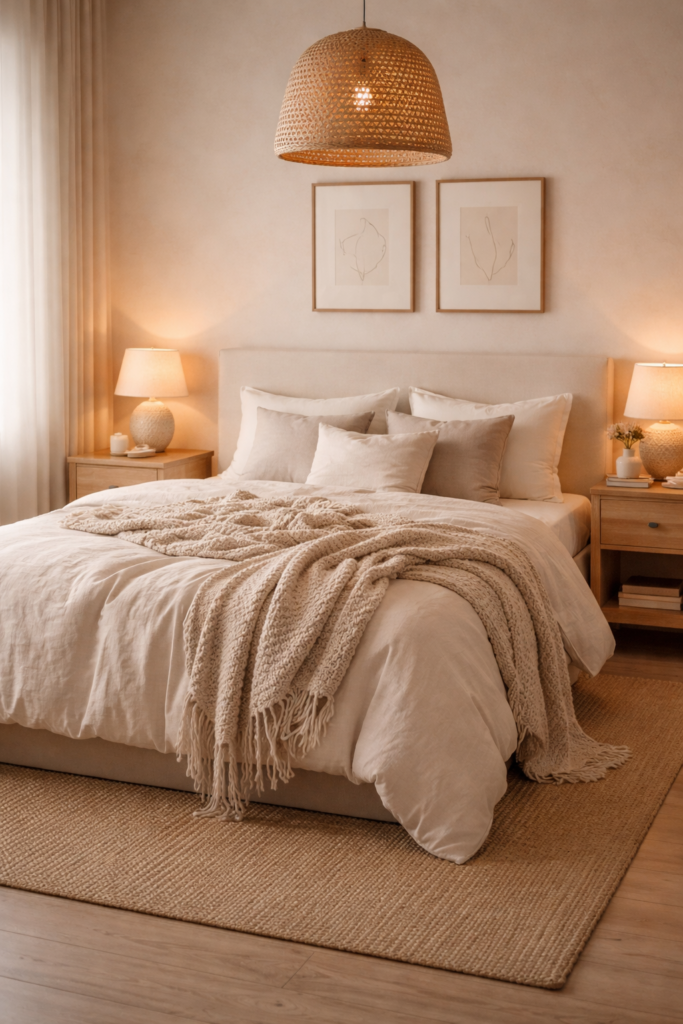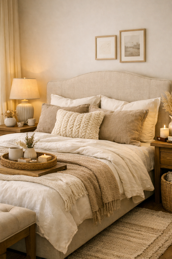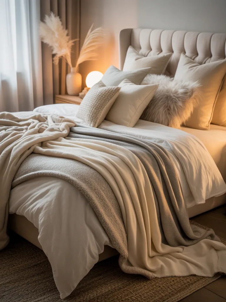 Cette accumulation de textures donne une impression de chaleur immédiate. En jouant avec différentes nuances de beige, crème et blanc cassé, vous renforcez l’harmonie visuelle. Ce type d’aménagement transforme votre lit en un véritable nid douillet, parfait pour se détendre après une longue journée.