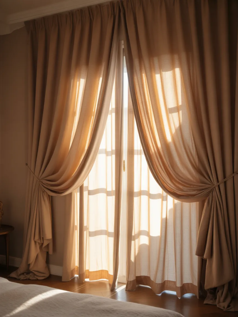 En optant pour des couleurs douces, vous renforcez l’ambiance apaisante. Les rideaux longs et fluides ajoutent une touche élégante et enveloppante. Ils complètent parfaitement l’atmosphère cosy de la chambre.
