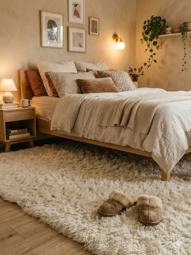 Placés sous le lit ou à côté, ils délimitent l’espace et ajoutent de la chaleur visuelle. Ils complètent parfaitement l’ambiance cosy et rendent la chambre encore plus accueillante.