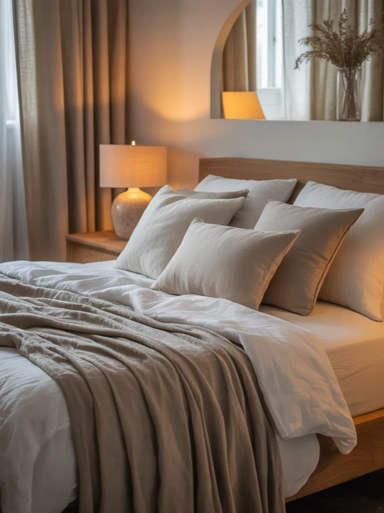 Les couleurs jouent un rôle essentiel dans un Havre de douceur cocooning pour le lit. Optez pour des tons neutres comme le beige, le taupe ou le blanc chaud afin de créer une ambiance calme et reposante. Ces couleurs favorisent la détente et apportent une sensation d’espace et de lumière.