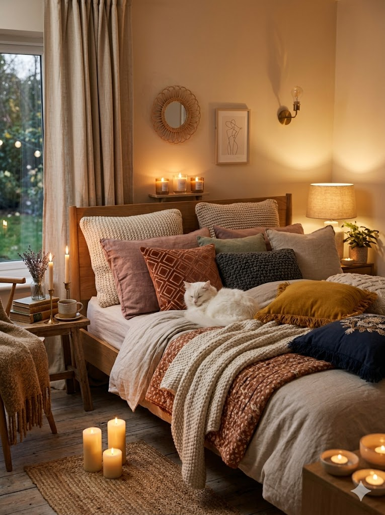 L’éclairage est un élément clé dans un havre de douceur cocooning pour le lit. Privilégiez des lampes à lumière chaude, des guirlandes lumineuses ou des bougies pour créer une atmosphère intime. Évitez les lumières trop fortes qui cassent l’effet cosy recherché.