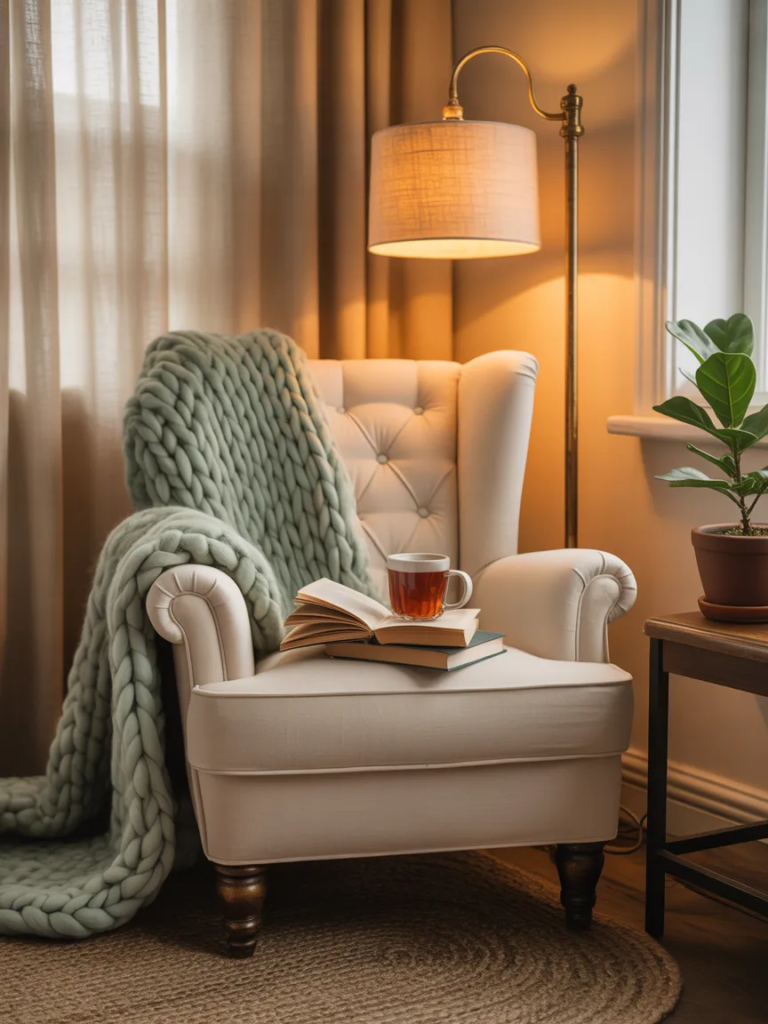 Un coin lecture complète parfaitement un havre de douceur cocooning pour le lit. Installez un fauteuil confortable avec une couverture douce et une lampe chaleureuse.