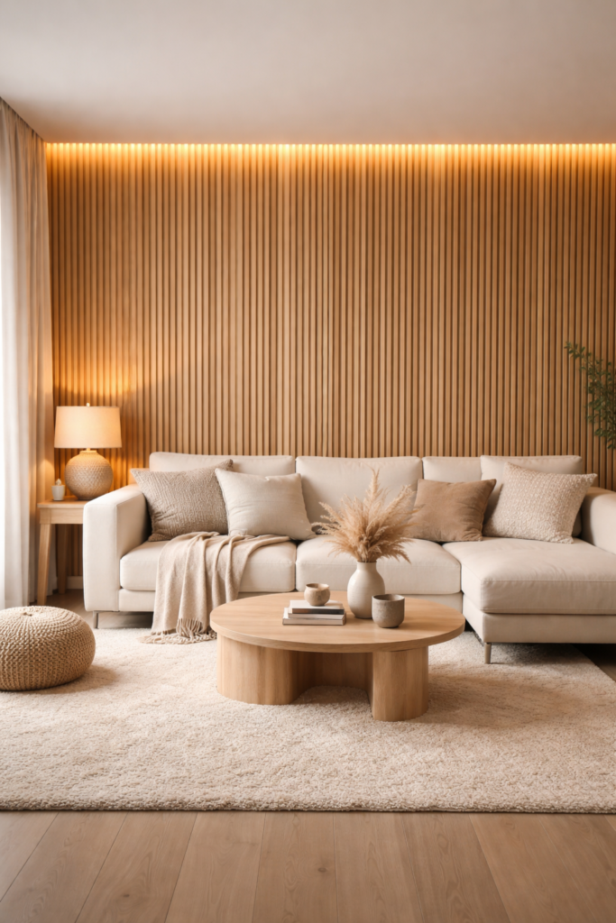 Un Idées de lattes en bois chaleureuses mur à lattes DIY pour cheminée doit être réalisé avec des matériaux résistants à la chaleur et respecter les distances de sécurité. Les teintes terreuses apportent profondeur et richesse visuelle, tandis qu’un mobilier neutre et un éclairage doux complètent l’ensemble de manière harmonieuse.