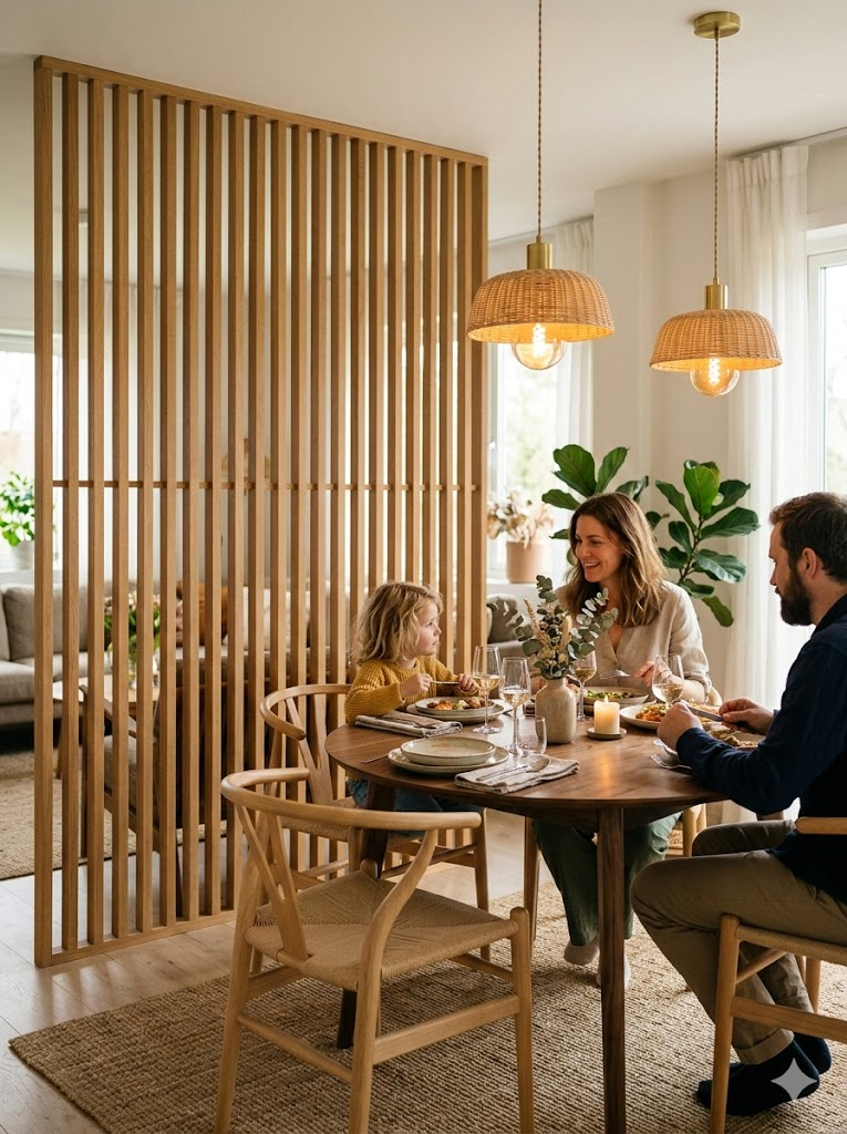 Un mur séparateur en lattes de bois aide à délimiter la salle à manger dans les espaces ouverts. Il sépare visuellement les zones tout en laissant passer la lumière. Le bois naturel apporte chaleur et élégance, rendant les repas plus conviviaux sans fermer complètement la pièce.