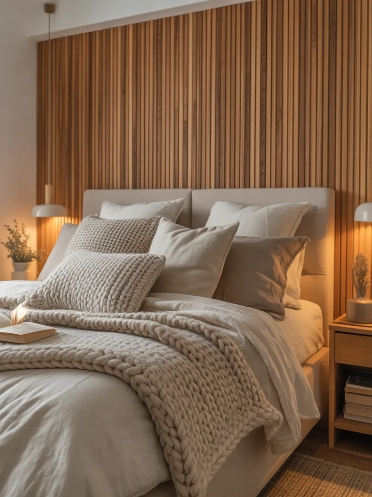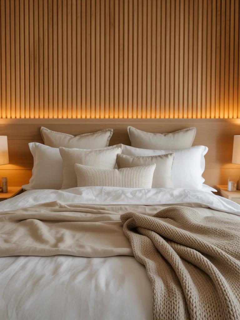 Un mur de lattes en bois derrière le lit sert de tête de lit intégrée et apporte de la chaleur à la chambre. Ce design remplace les meubles encombrants tout en gardant l’espace visuellement ouvert. Les teintes claires du bois favorisent une ambiance calme et s’accordent parfaitement avec le linge de lit en lin et un éclairage doux pour un rendu harmonieux.