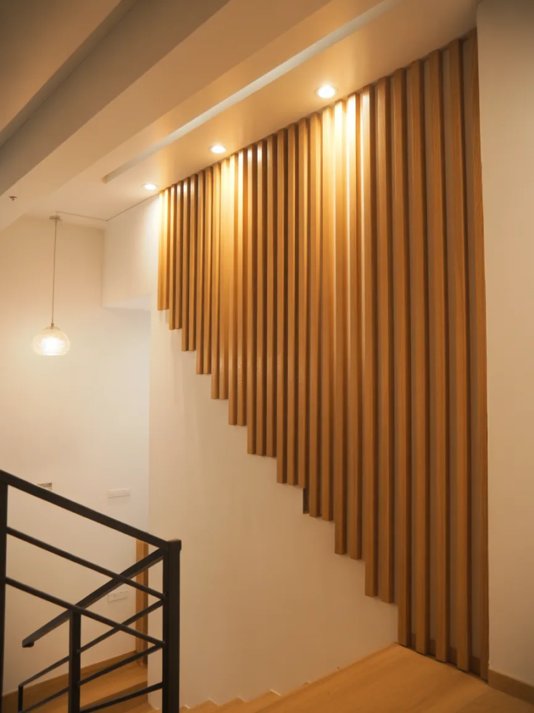 Les Idées de lattes en bois chaleureuses apportent du caractère aux couloirs étroits et longs. Les lignes verticales augmentent la sensation de hauteur tout en reflétant une lumière douce et agréable. Cette solution donne une vraie identité aux espaces souvent négligés et les transforme en zones élégantes et accueillantes.