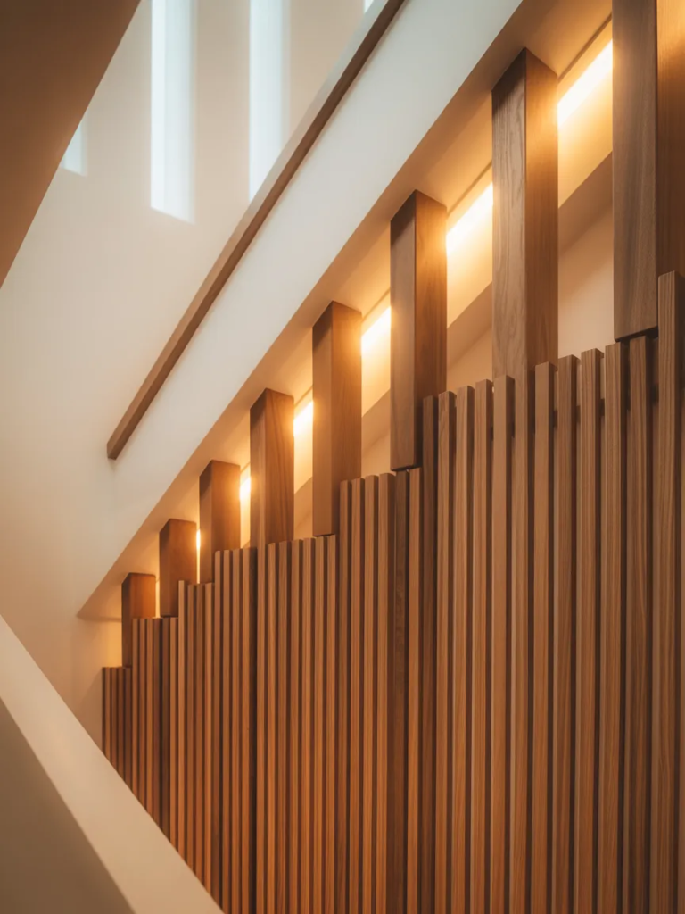 Un mur de lattes en bois le long d’un escalier apporte du caractère et du mouvement à la maison. Il guide le regard vers le haut et adoucit les lignes architecturales. Les tons chauds du bois donnent vie aux zones de passage souvent négligées.