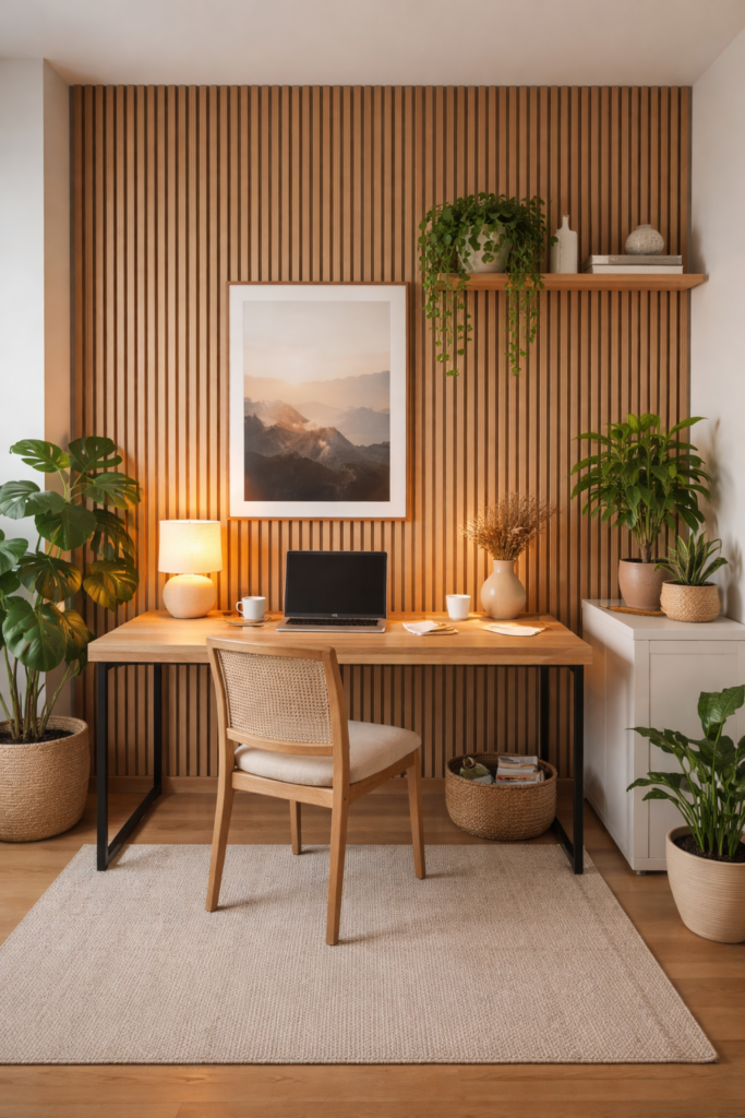 Un mur à lattes DIY dans un bureau peut aussi dissimuler les câbles et les prises. De petites étagères peuvent être ajoutées pour la décoration ou le rangement. Un éclairage doux et des plantes renforcent l’ambiance et transforment un simple bureau en espace créatif.