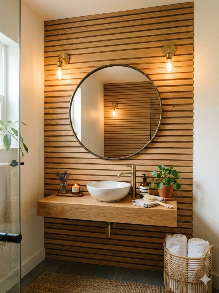 Un mur de lattes en bois dans la salle de bain crée une ambiance de spa. Il se marie bien avec des vasques en pierre et des miroirs ronds, combinant textures naturelles et équipements modernes. Le bois traité apporte chaleur tout en résistant à l’humidité.