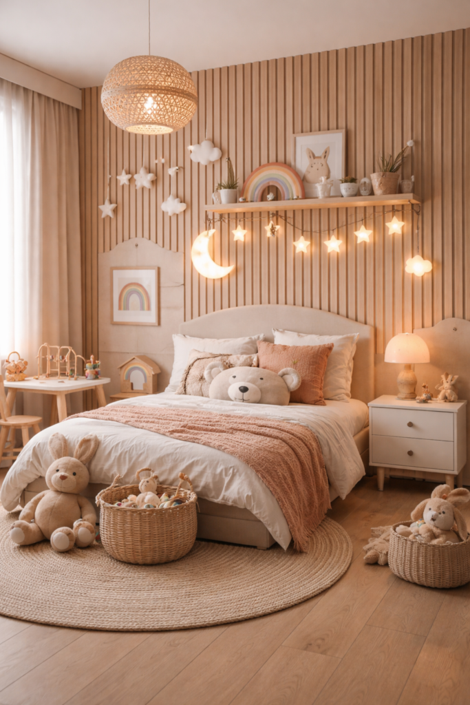 Un mur à lattes DIY peut intégrer des crochets ou des étagères pour sacs et livres. Les bords arrondis améliorent la sécurité, et les murs aux couleurs pastel renforcent l’aspect doux. Ce design évolue avec l’enfant et reste esthétique dans le temps.