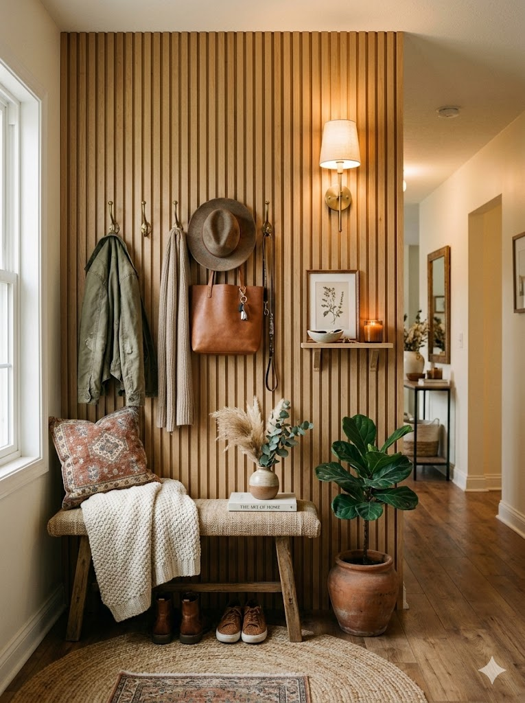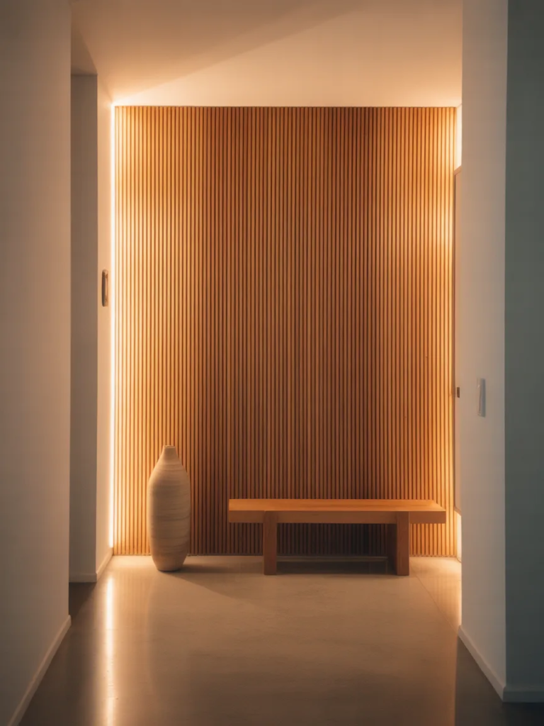 Un mur à lattes DIY dans l’entrée peut être complété par un banc fin et un miroir. Utilisez une finition résistante pour supporter l’usage quotidien. Un éclairage mural chaud met en valeur la texture et les ombres, transformant un simple couloir en zone d’accueil élégante et pratique grâce aux Idées de lattes en bois chaleureuses.