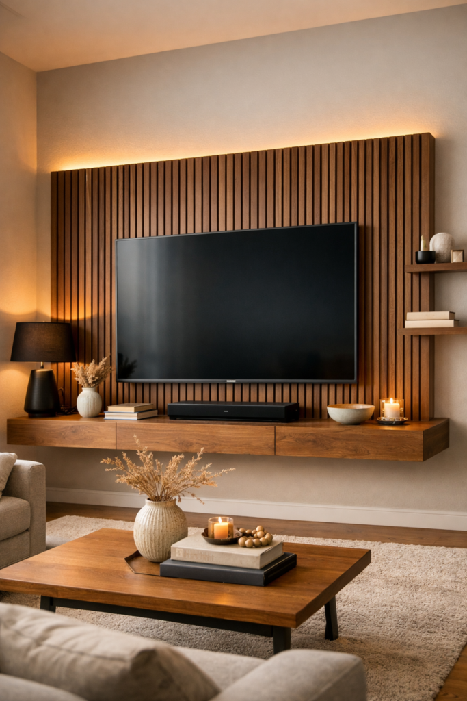 Pour un mur à lattes DIY, fixez les lattes sur une base en contreplaqué afin d’obtenir une structure solide. Laissez de petits espaces pour la ventilation et le passage des câbles. Des étagères flottantes peuvent être ajoutées pour la décoration ou les enceintes, donnant un aspect sur mesure à moindre coût.
