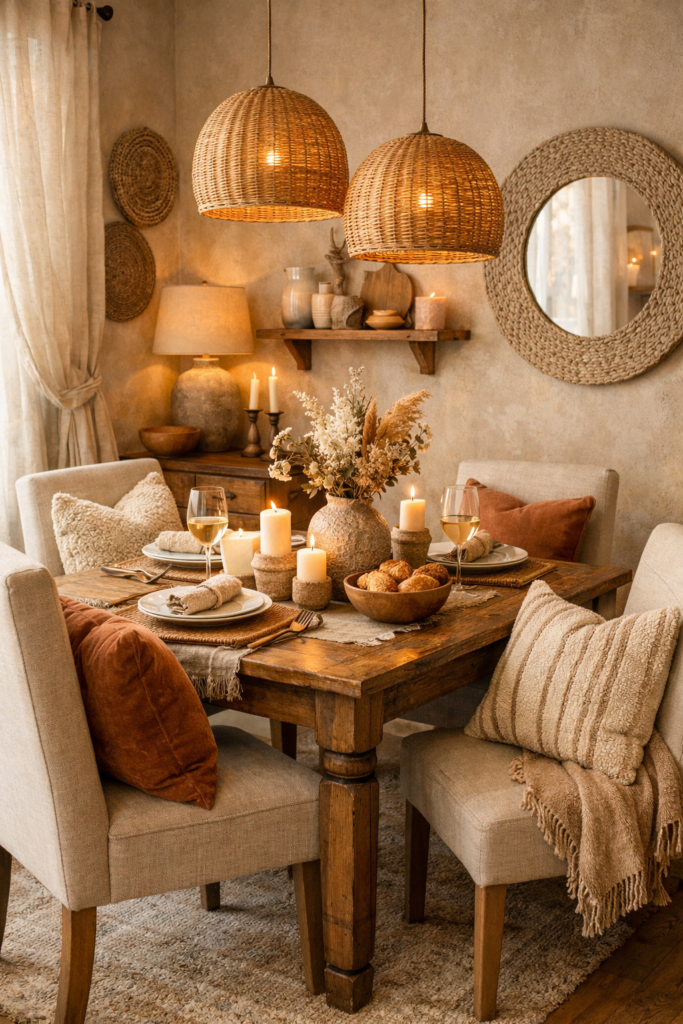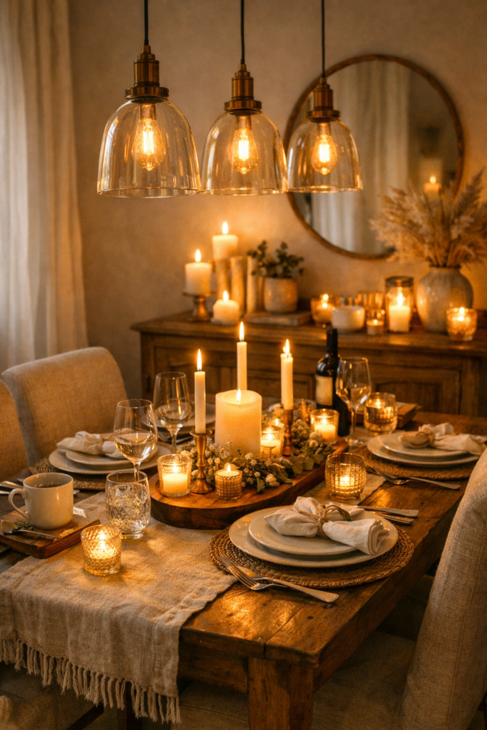 Les suspensions au-dessus de la table ou les bougies décoratives sont parfaites dans les Idées de salle à manger chaleureuse. Elles diffusent une lumière douce qui rend l’espace encore plus accueillant.