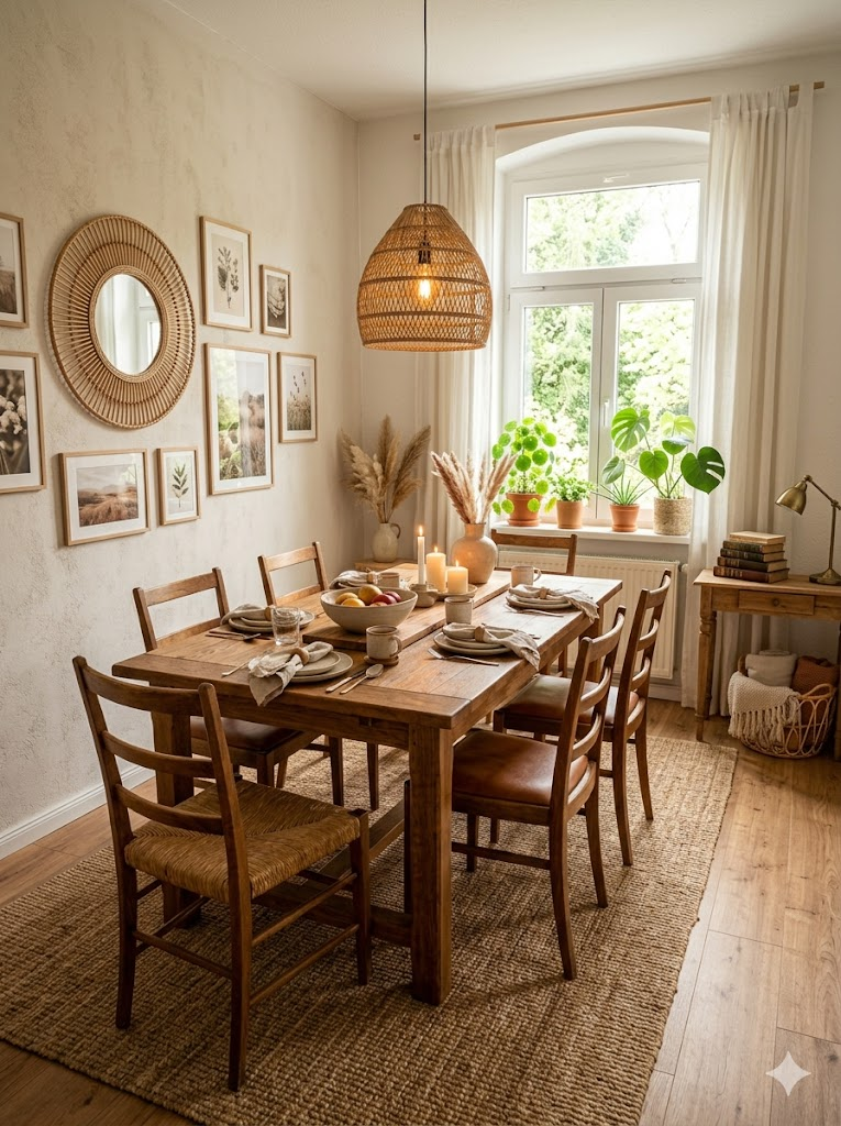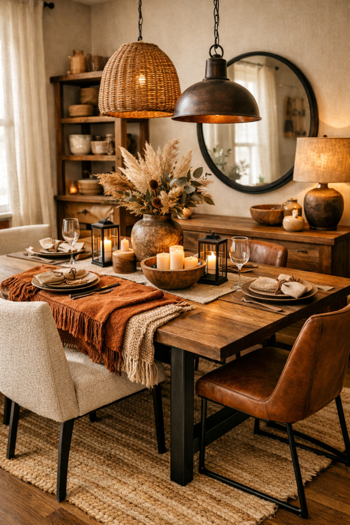 Les Idées de salle à manger chaleureuse utilisent ce mélange pour donner du caractère à la pièce tout en conservant une harmonie visuelle.