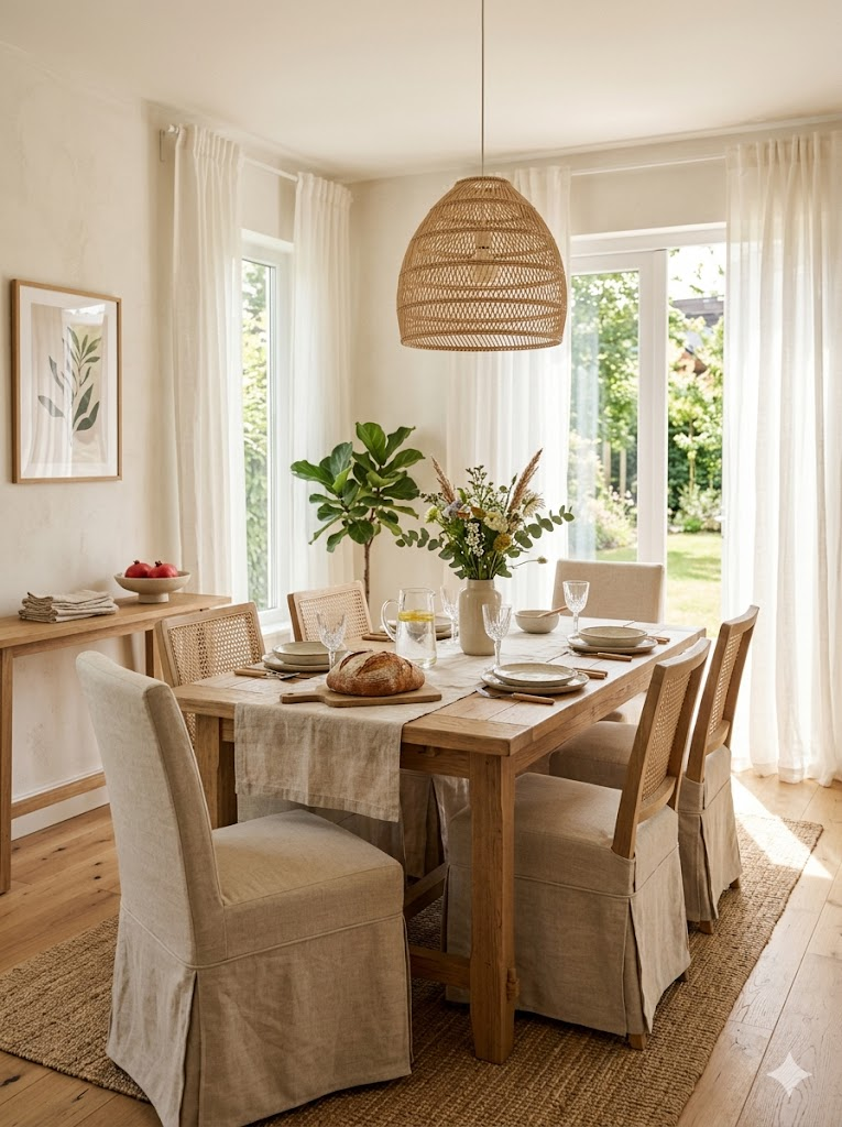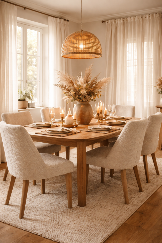 Dans les Idées de salle à manger chaleureuse, ces éléments permettent d’adoucir l’espace tout en ajoutant une touche esthétique. Ils contribuent également à créer une ambiance plus intime et conviviale.